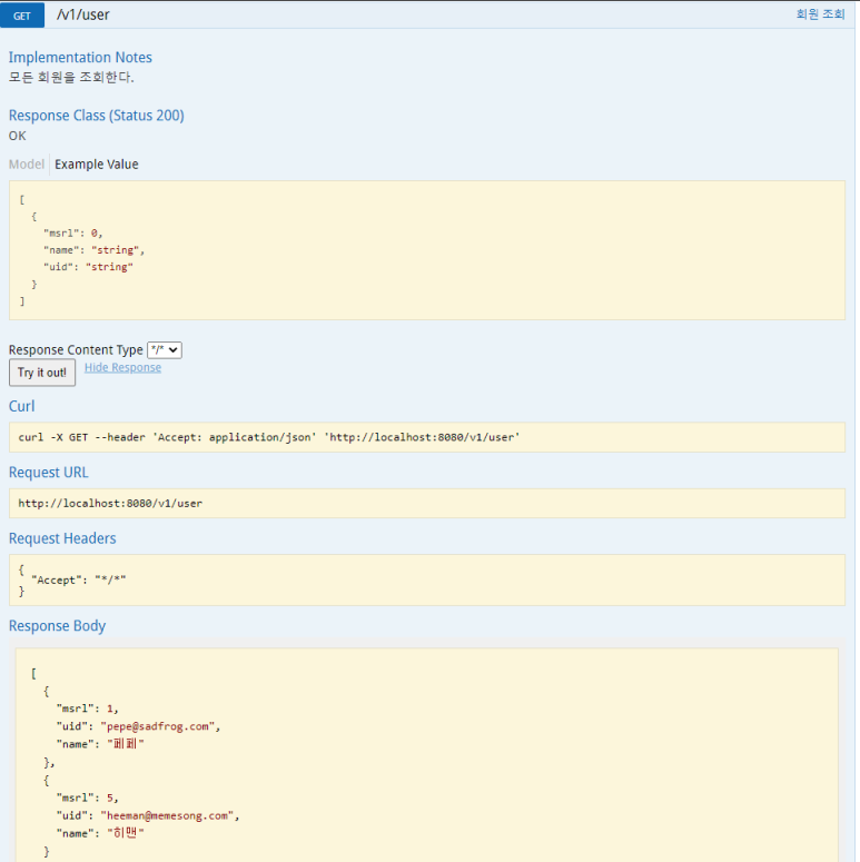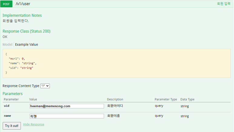 Try it out! 을 클릭하면 응답 결과도 확인 가능하다.