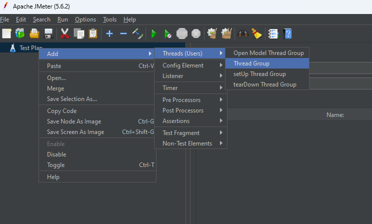 Test Plan을 오른쪽 마우스 클릭하여 Thread Group을 추가합니다.